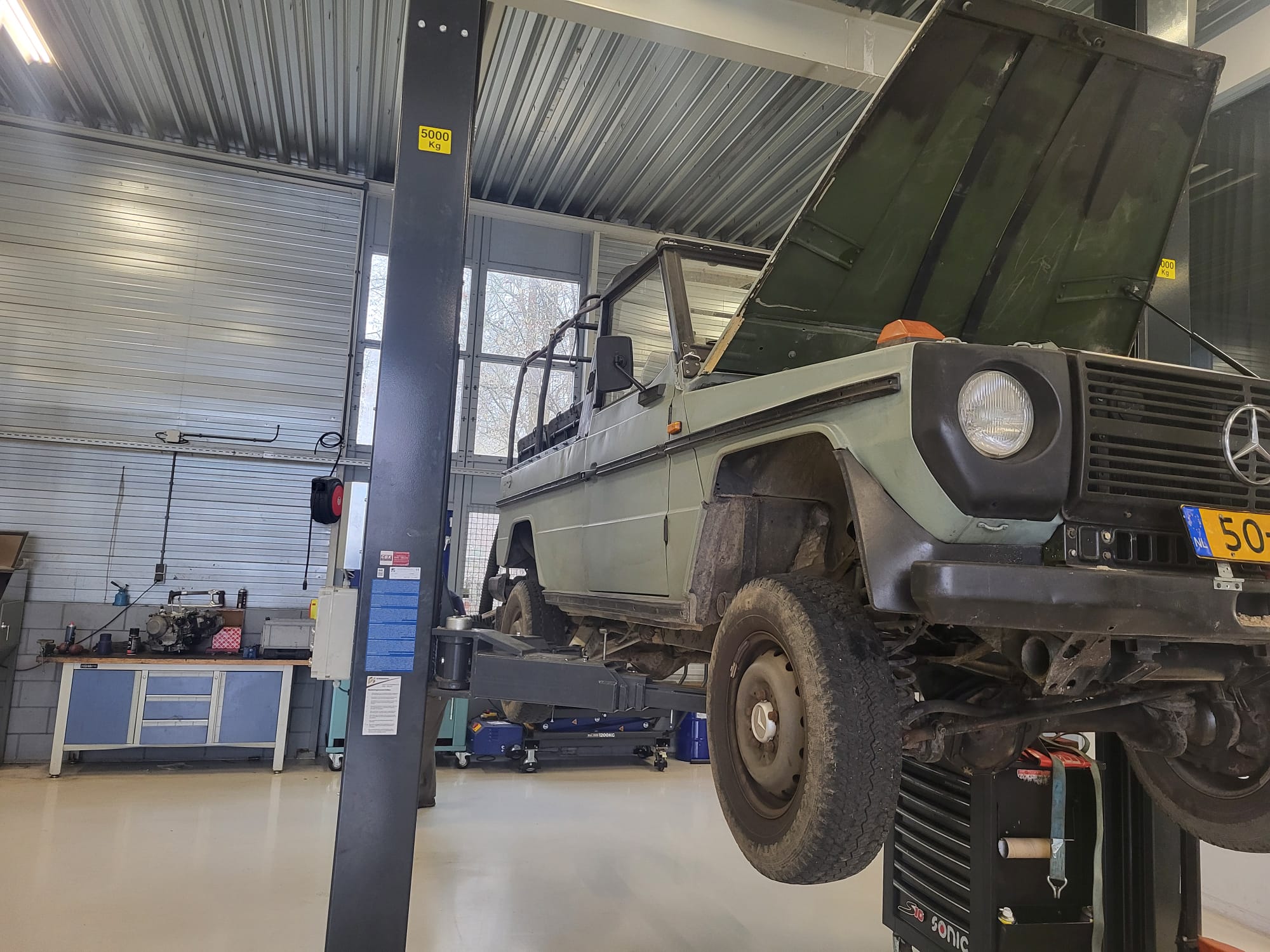 Tevens werden de aanwezige voertuigen, 2 Porsches, een Cobra replica, een koekblik op de lift met de wielen er onder en natuurlijk de “nieuwe” Mercedes G van Ricardo, door de liefhebbers bekeken en gefotografeerd.